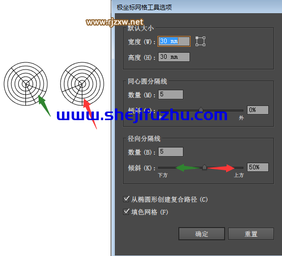 第六步:径向分隔线,就是5条直线,上方与下方的区别如图所录:径向数量就是设置直线的数量。